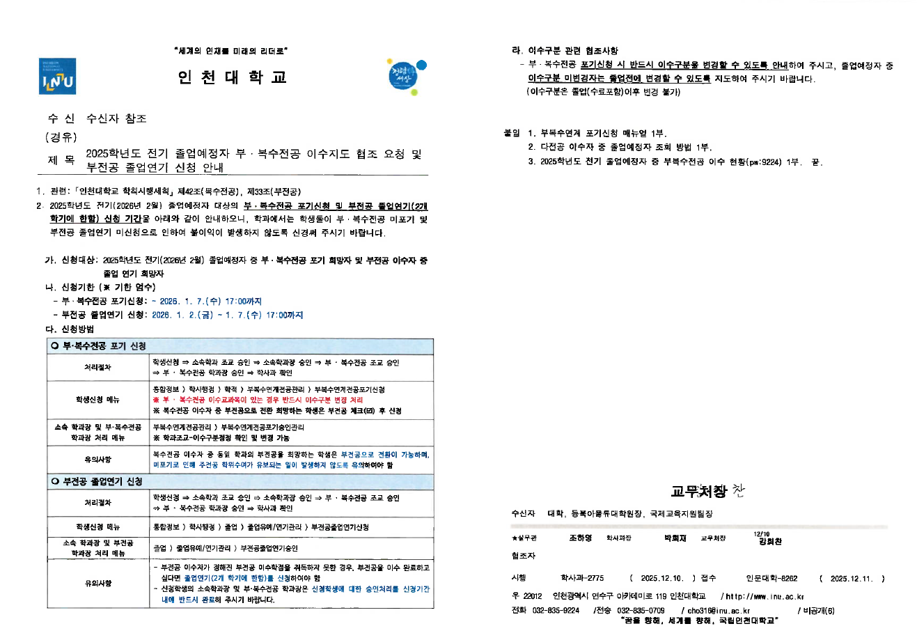 2025학년도 전기 졸업예정자 부·복수전공 포기 및 부전공 졸업연기 신청 안내